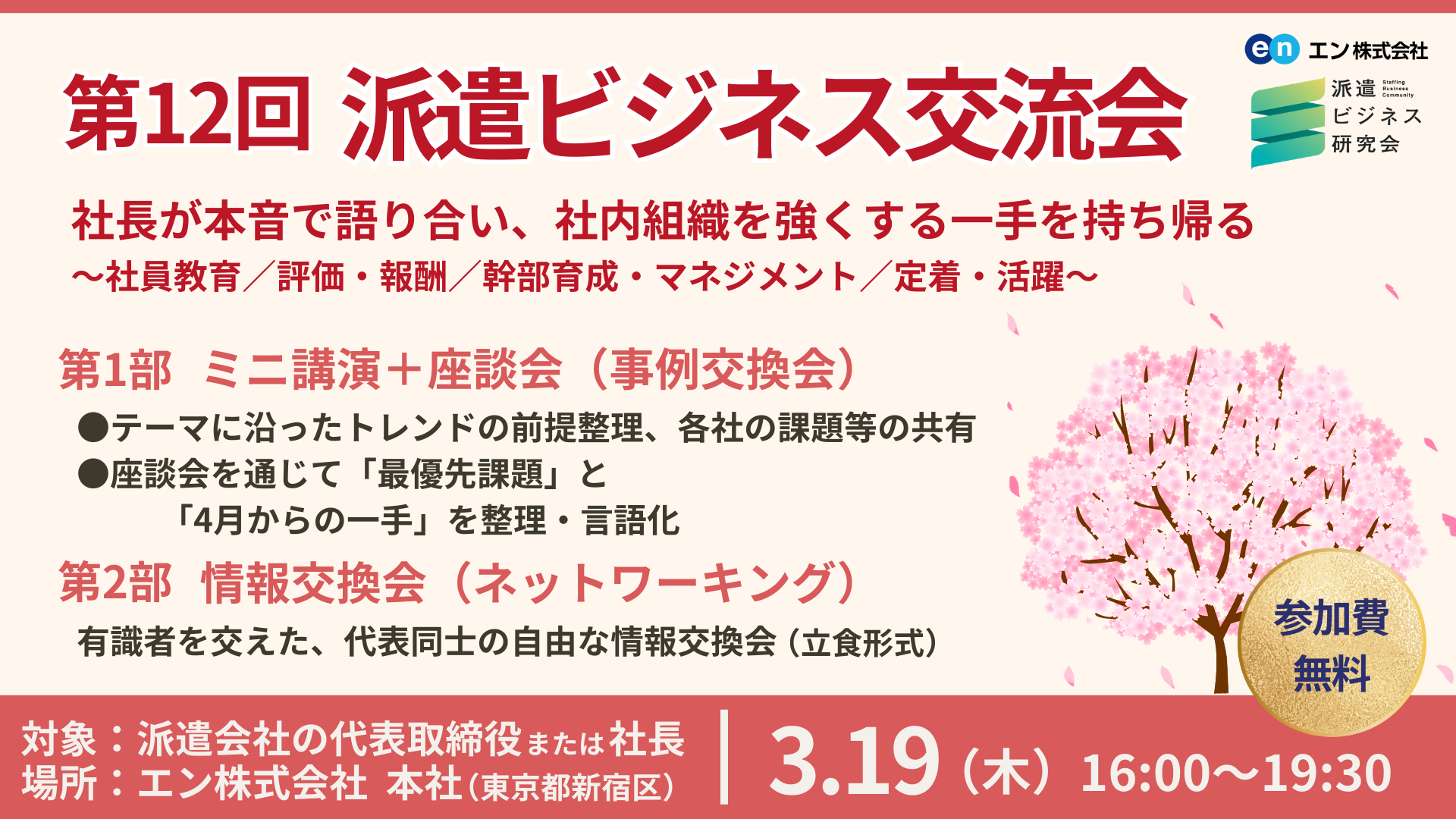 | 内容 | ーーーーーーーーーーーーーーーーーーーーーーーーーーーーーーーーーーー プログラム ーーーーーーーーーーーーーーーーーーーーーーーーーーーーーーーーーーー ■□第1部 ミニ講演+座談会(事例交換会)□■ ●テーマに沿ったトレンドの前提整理 (「気持ち」ではなく「仕組み」として捉える視点) ●事前アンケートをもとに、各社の課題・取り組み状況を共有し、社長同士で深掘り ●座談会を通じて、各社の「最優先課題」と「4月からの一手」を 整理・言語化(持ち帰りのアクション化) ※当日の進行・講演内容は、参加者の皆さまの課題感や議論の状況により、 予告なく変更となる場合がございます。あらかじめご了承ください。 (主な議論トピック例) ・社員教育(育成を属人化させない仕組み) ・評価制度/報酬(納得感を生む設計と運用) ・幹部育成/マネジメント(任せられる人材の発見と育成) ・定着/活躍(離職抑制だけでなく“伸びる状態”の設計) ■□第2部 情報交換会(ネットワーキング)□■ 第1部の内容を踏まえ、各社代表の皆さま同士で、 より具体的な情報交換・ネットワーキングを行う交流パートです。 ※アルコール/ノンアルコール飲料および軽食をご用意します(椅子あり) ーーーーーーーーーーーーーーーーーーーーーーーーーーーーーーーーーーー 参加特典 ーーーーーーーーーーーーーーーーーーーーーーーーーーーーーーーーーーー (当日参加限定)当日資料 ーーーーーーーーーーーーーーーーーーーーーーーーーーーーーーーーーーー 注意事項 ーーーーーーーーーーーーーーーーーーーーーーーーーーーーーーーーーーー ※本会は1社1名、派遣会社の代表取締役および社長の方のみがご参加いただけます。 ※同業者様、及び法人ドメインのアドレスでない方のご参加は お断りさせていただく場合がございます。 ※ご参加にあたり、WEB上での事前アンケートの記入および提出を必須とします。 ※本会の趣旨上、第1部のみのご参加は不可となります。 ※今回の議論対象は、社内の営業職や内勤職、管理職などの方々となります。 派遣先で就業する派遣スタッフは含みません。 (派遣スタッフに関しては別機会での開催予定です) |